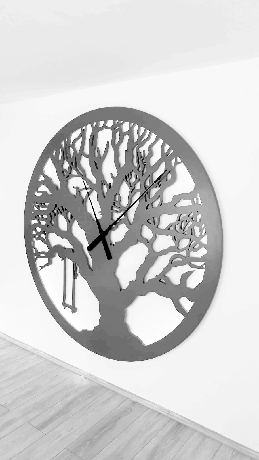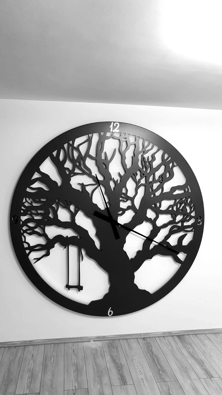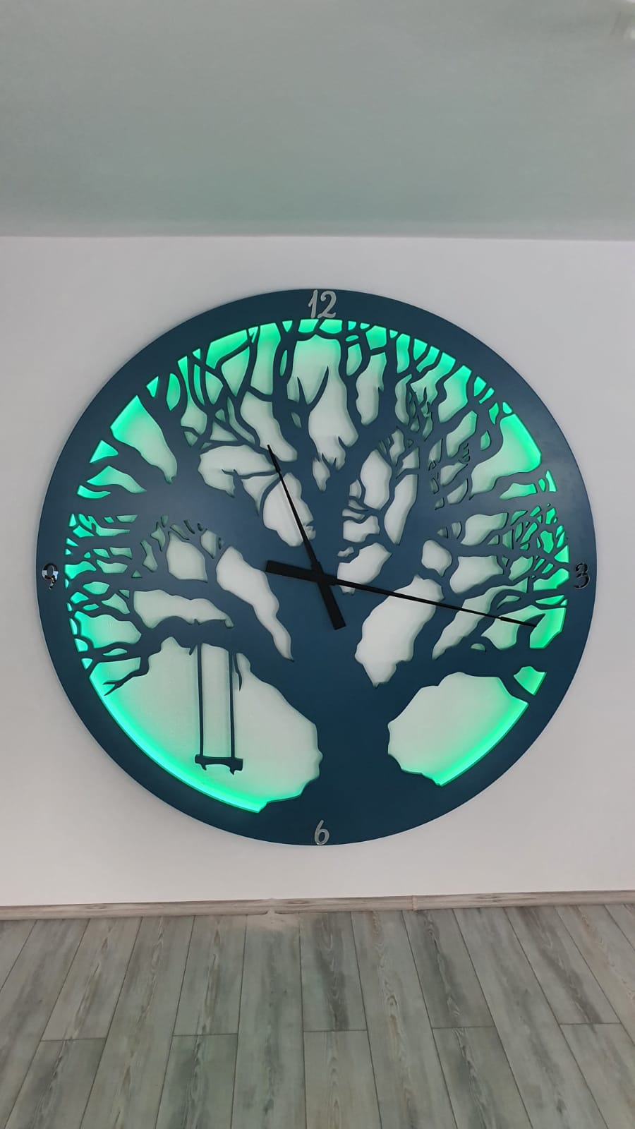 Ceas decorativ, iluminat, vopsit culoare speciala, din material MDF - Model Arbore cu leagan Dimensiuni: 100 cm x100 cm