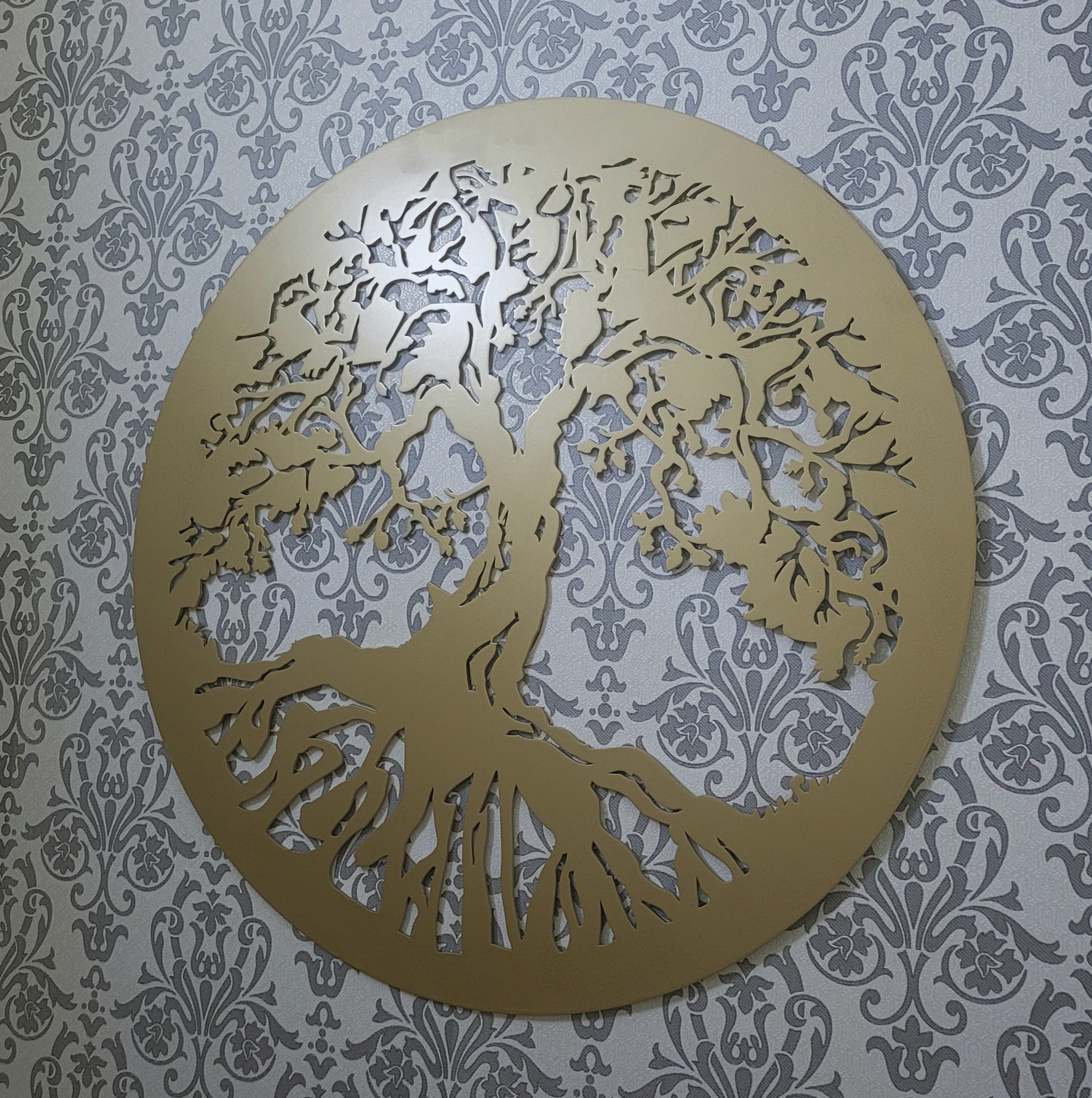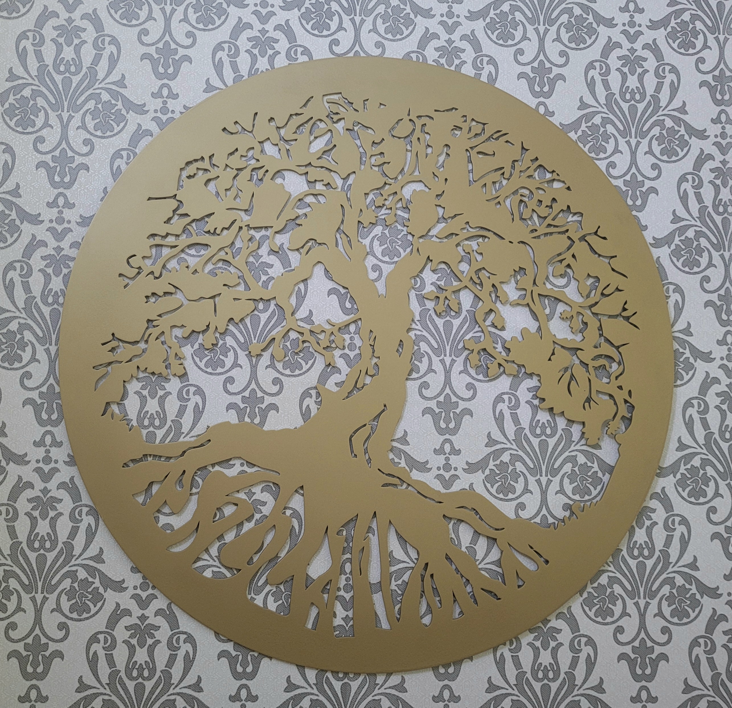Decoratiune – "Copacul Vietii". Este realizata din material MDF, nuanta: Auriu. Dimensiuni: 84cm x 84cm