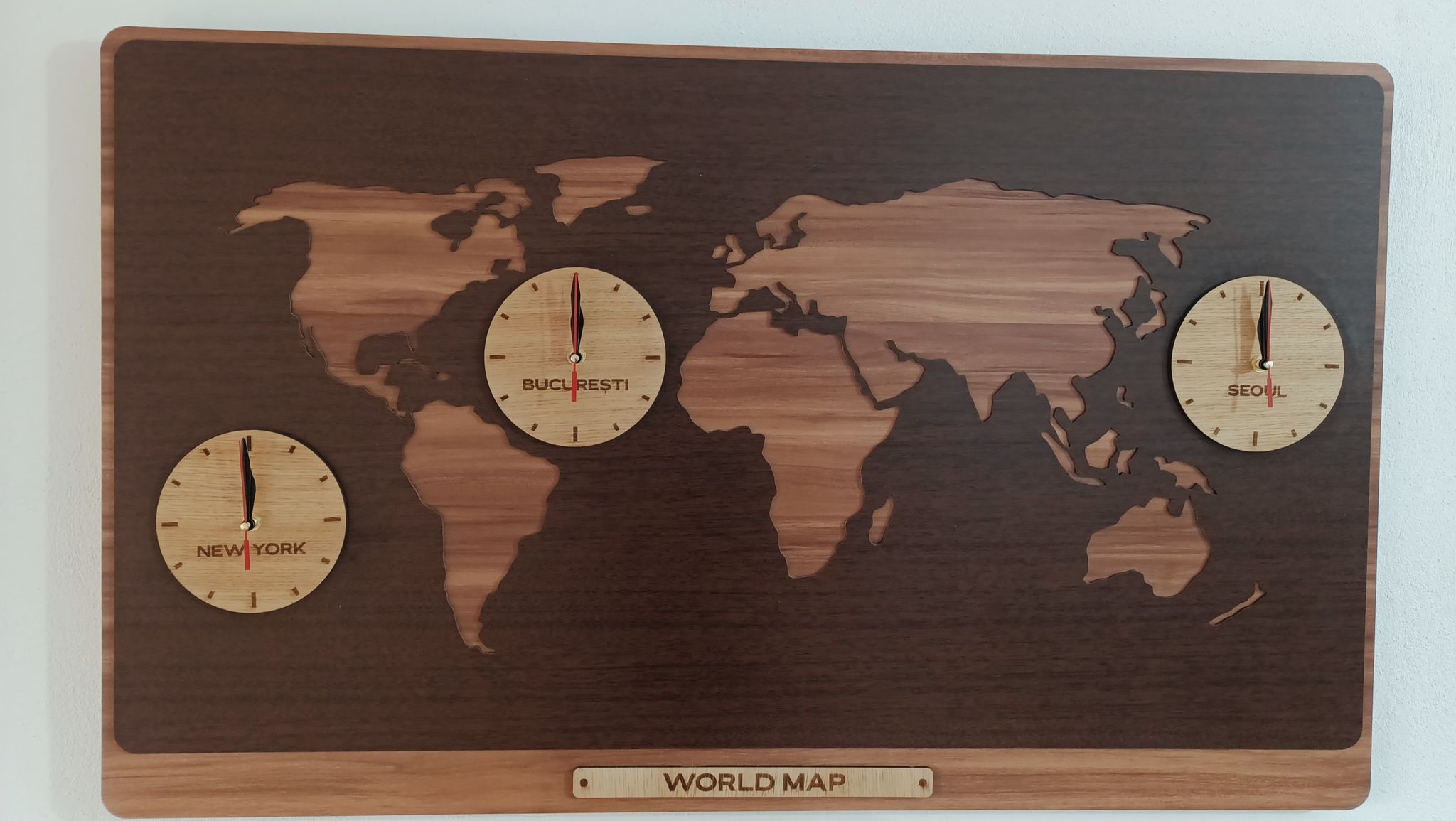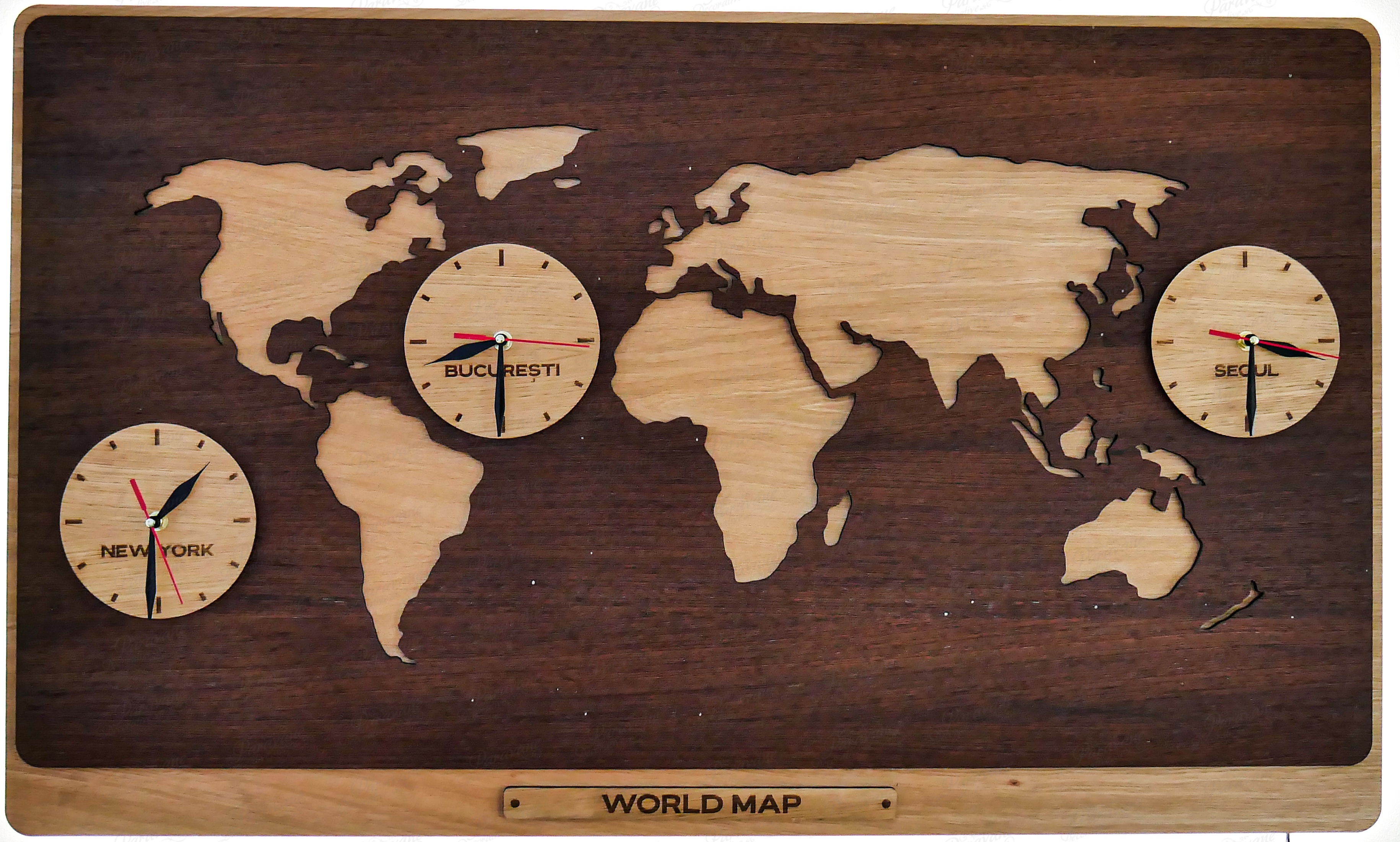 Nuante: wenge (lemn), stejar natur si prun (894 lei/bucata) sau material HDF nuante wenge si stejar, cu ceasuri incorporate functionale cu trei fusuri orare diferite( in functie de orasul ales de pe harta).