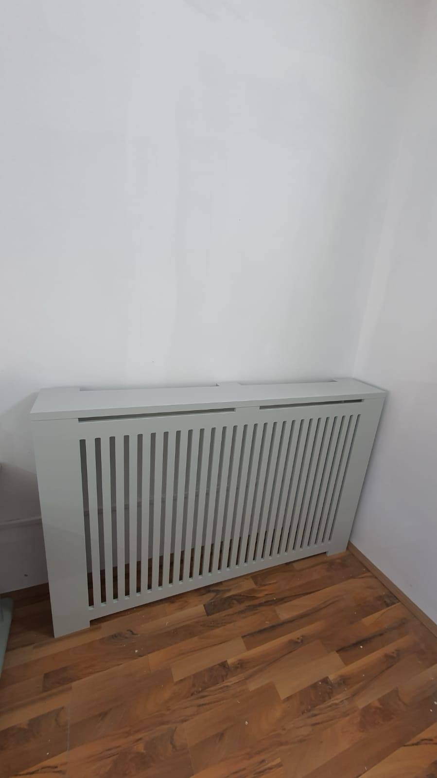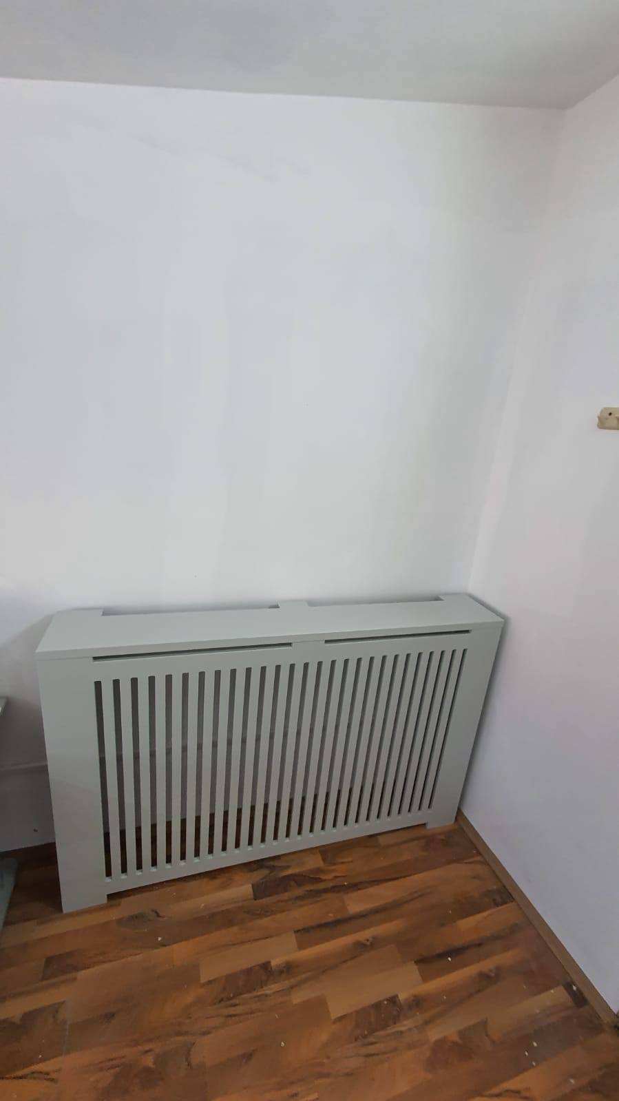 Masca de calorifer din material MDF vopsit, cu linii verticale si cu picior drept, nuanta RAL 7004.