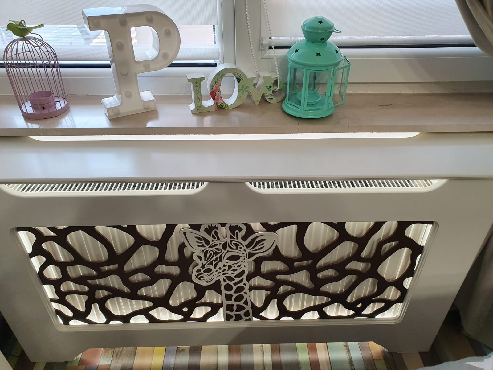 Masca de calorifer cu picior drept din material MDF vopsit, combinatie de culori - Model Baby Giraffe