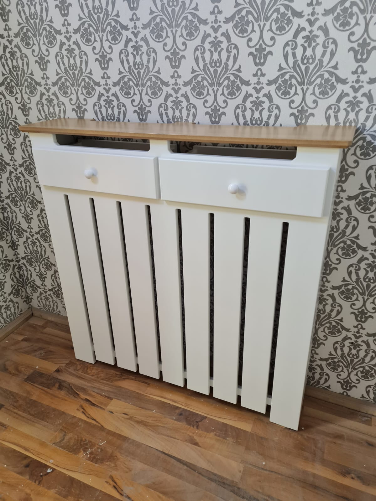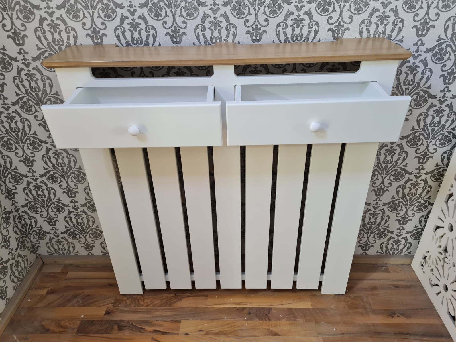 Masca de calorifer cu picior drept din material MDF vopsit, polita din MDF furniruit si sertare functionale - Model Romburi