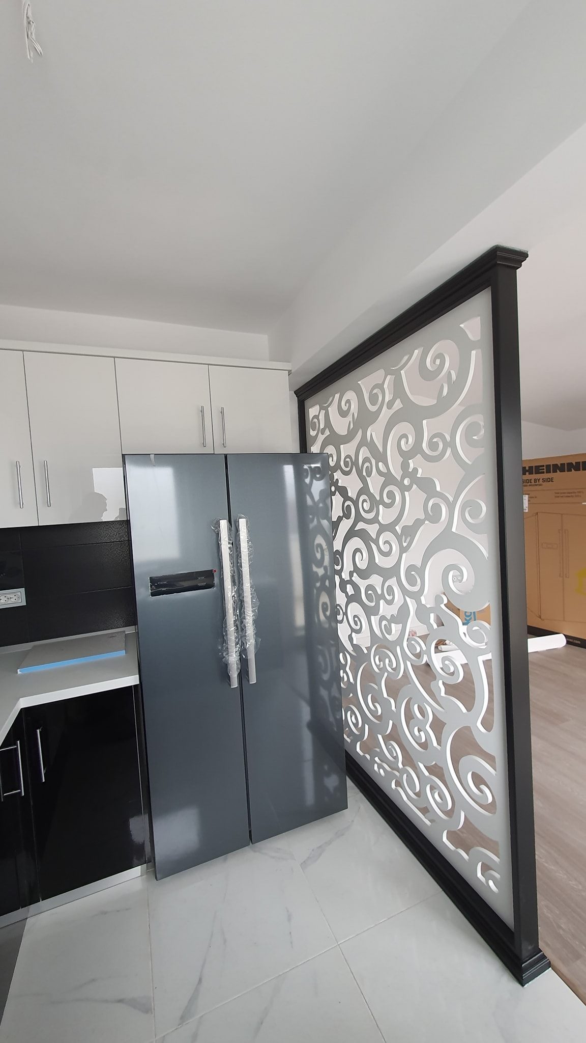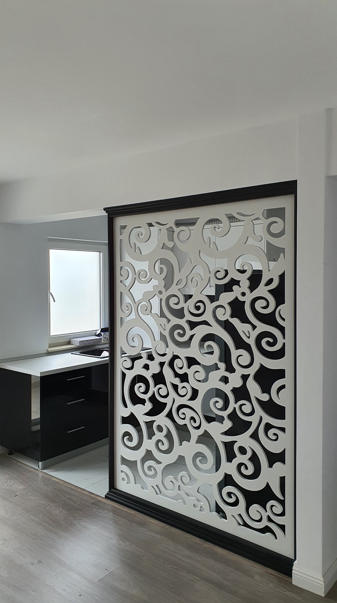 Paravan decorativ (ornamental), despartitor din material MDF vopsit in doua nuante, cu rama adaugata - Model Bucle