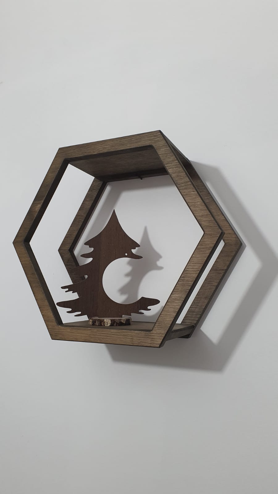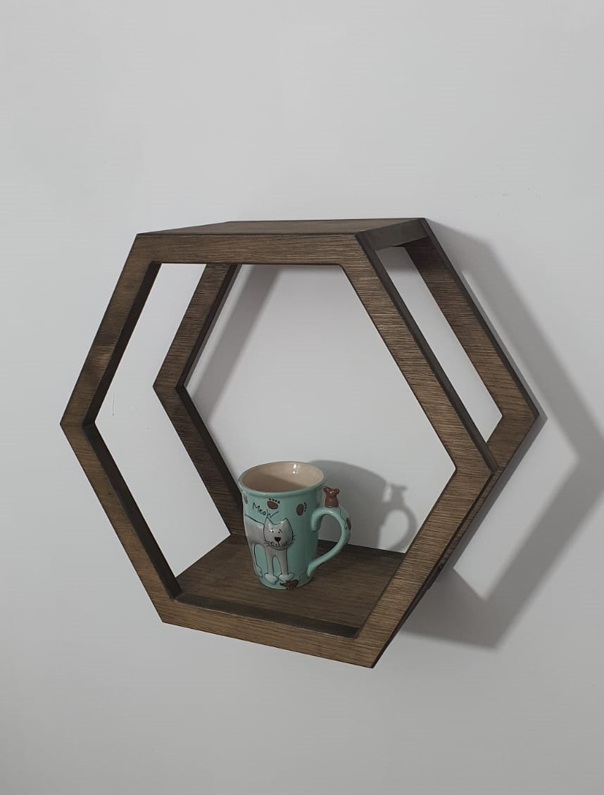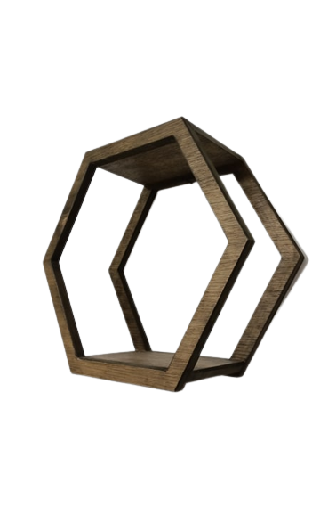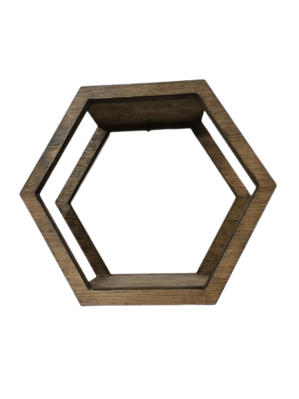 Raft hexagonal pentru perete din material MDF furniruit invechit. Dimensiuni: H 42cm x L 48,5cm x AD 19,5 cm. LICHIDARE DE STOC!