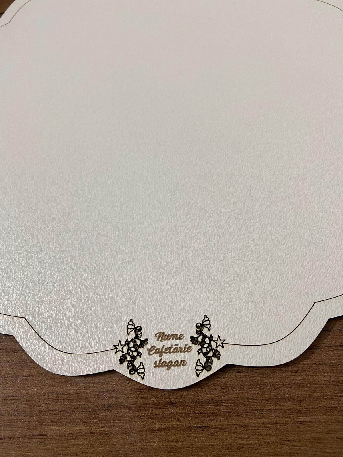 Produsele de patiserie si prajiturile sunt unele dintre cele mai importante elemente ale evenimentelor din viata dumneavoastra. Avand in vedere acest lucru, am creat pentru dvs. un suport care va permite sa transportati in siguranta produsele de cofetarie. Suportul pentru tort este rigid din material HDF alb, 3mm. Se poate grava numele cofetariei, sloganul sau text personalizat.
