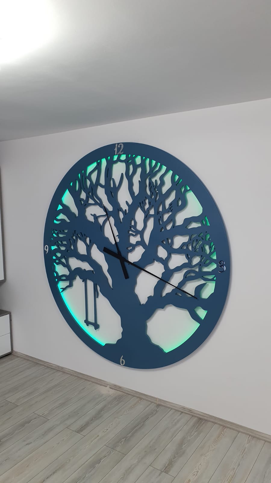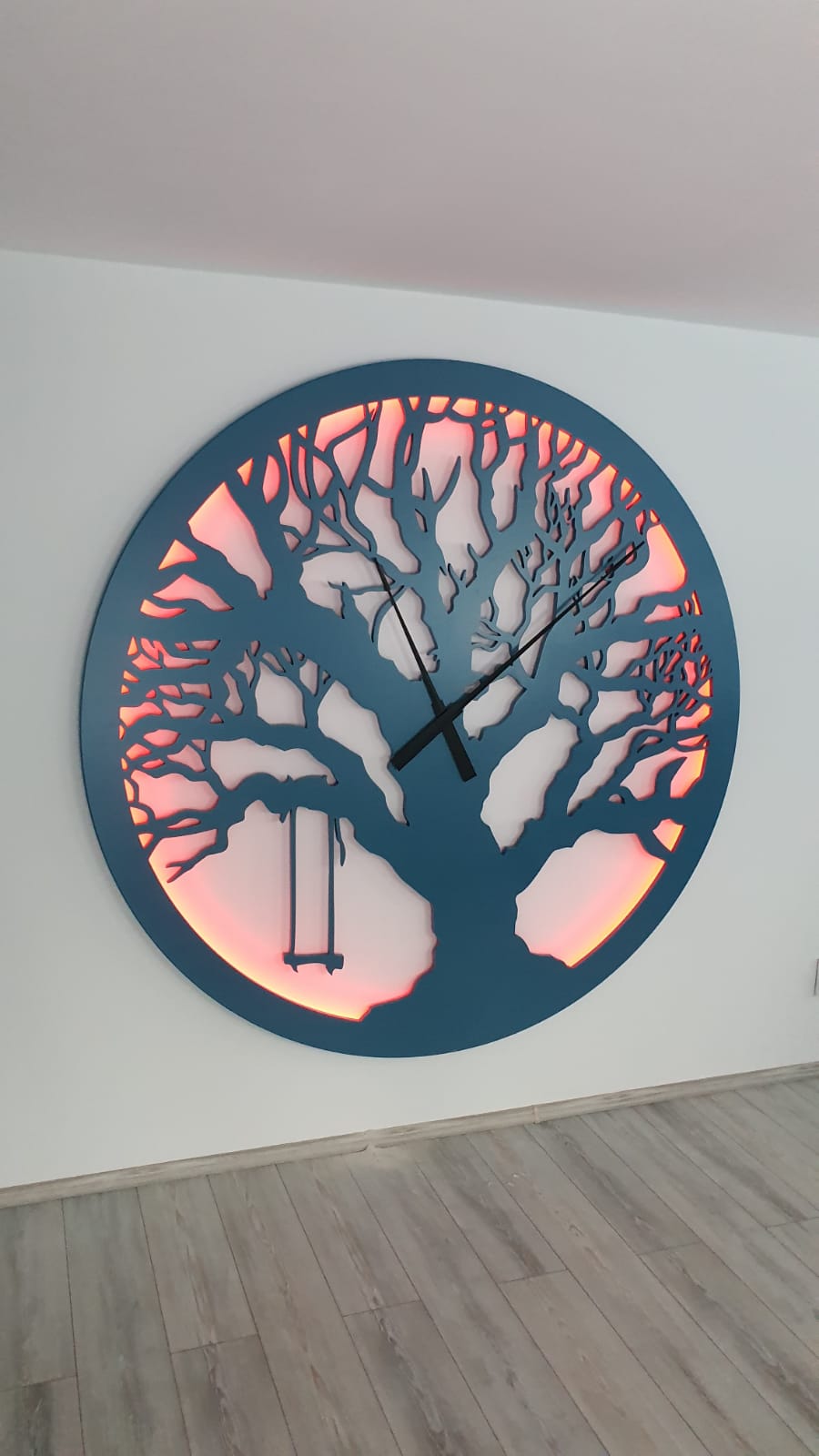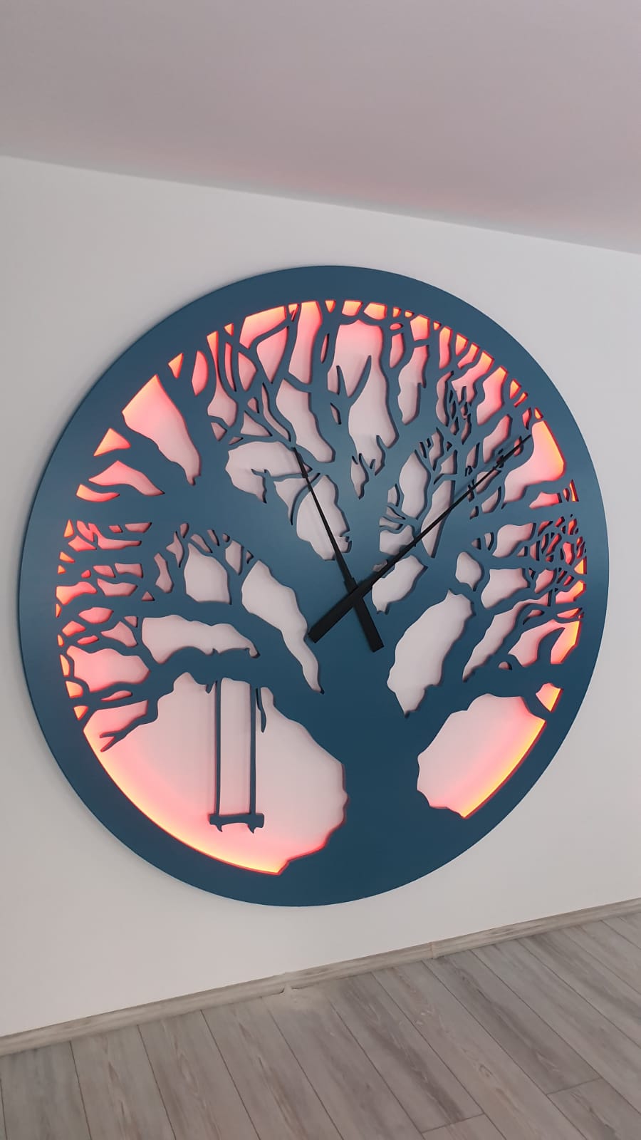 Ceas decorativ, iluminat, vopsit culoare speciala, din material MDF - Model Arbore cu leagan Dimensiuni: 100 cm x100 cm