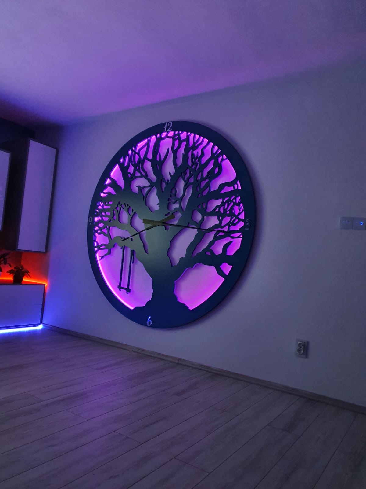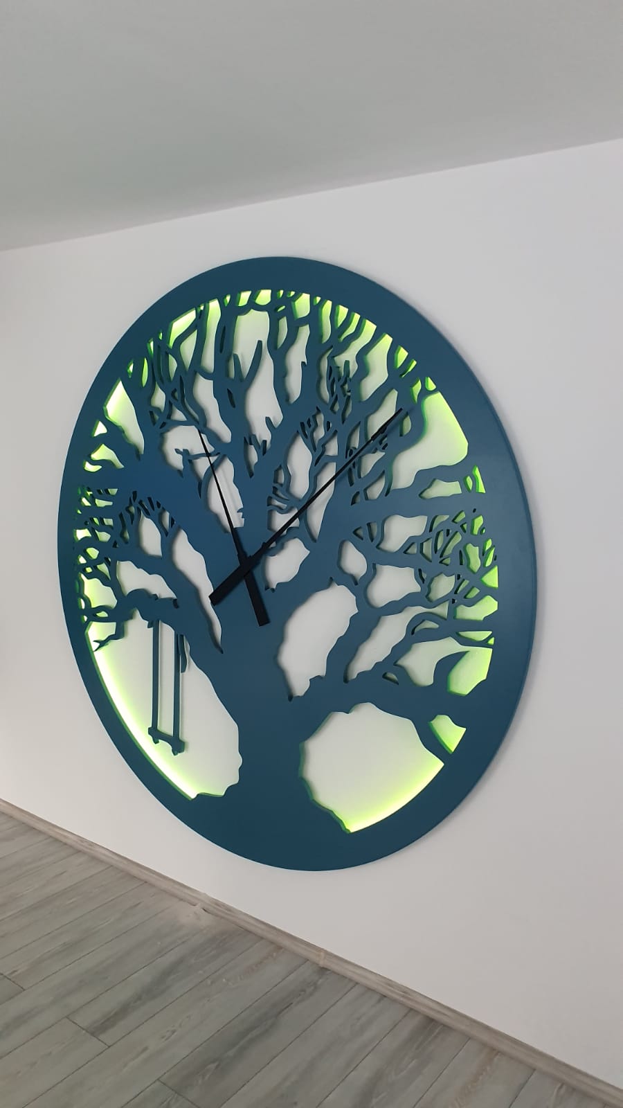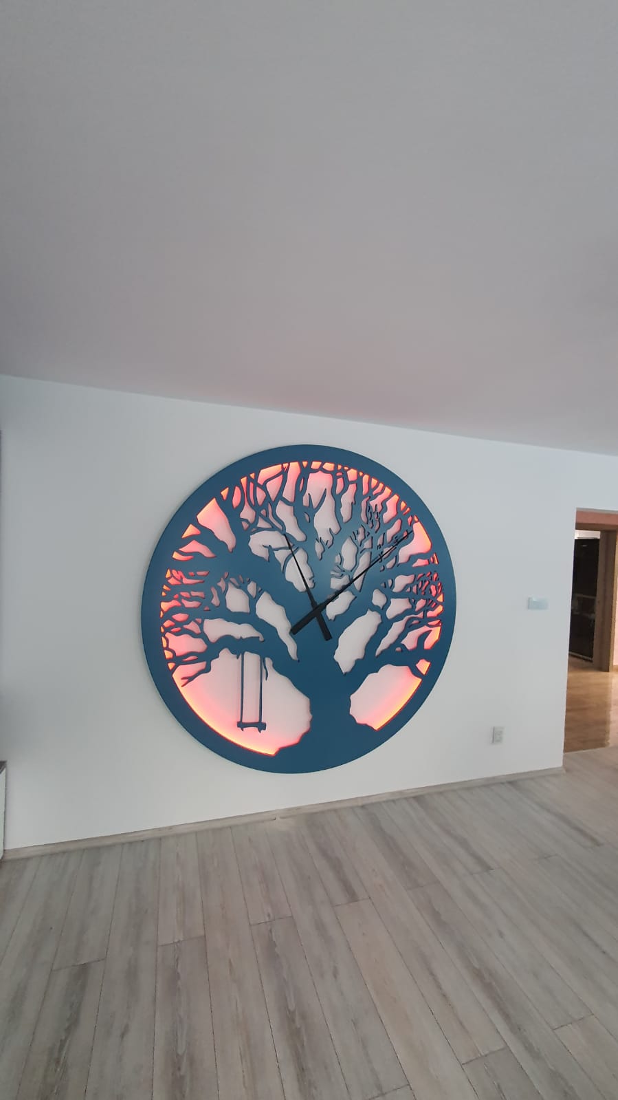 Ceas decorativ, iluminat, vopsit culoare speciala, din material MDF - Model Arbore cu leagan Dimensiuni: 100 cm x100 cm