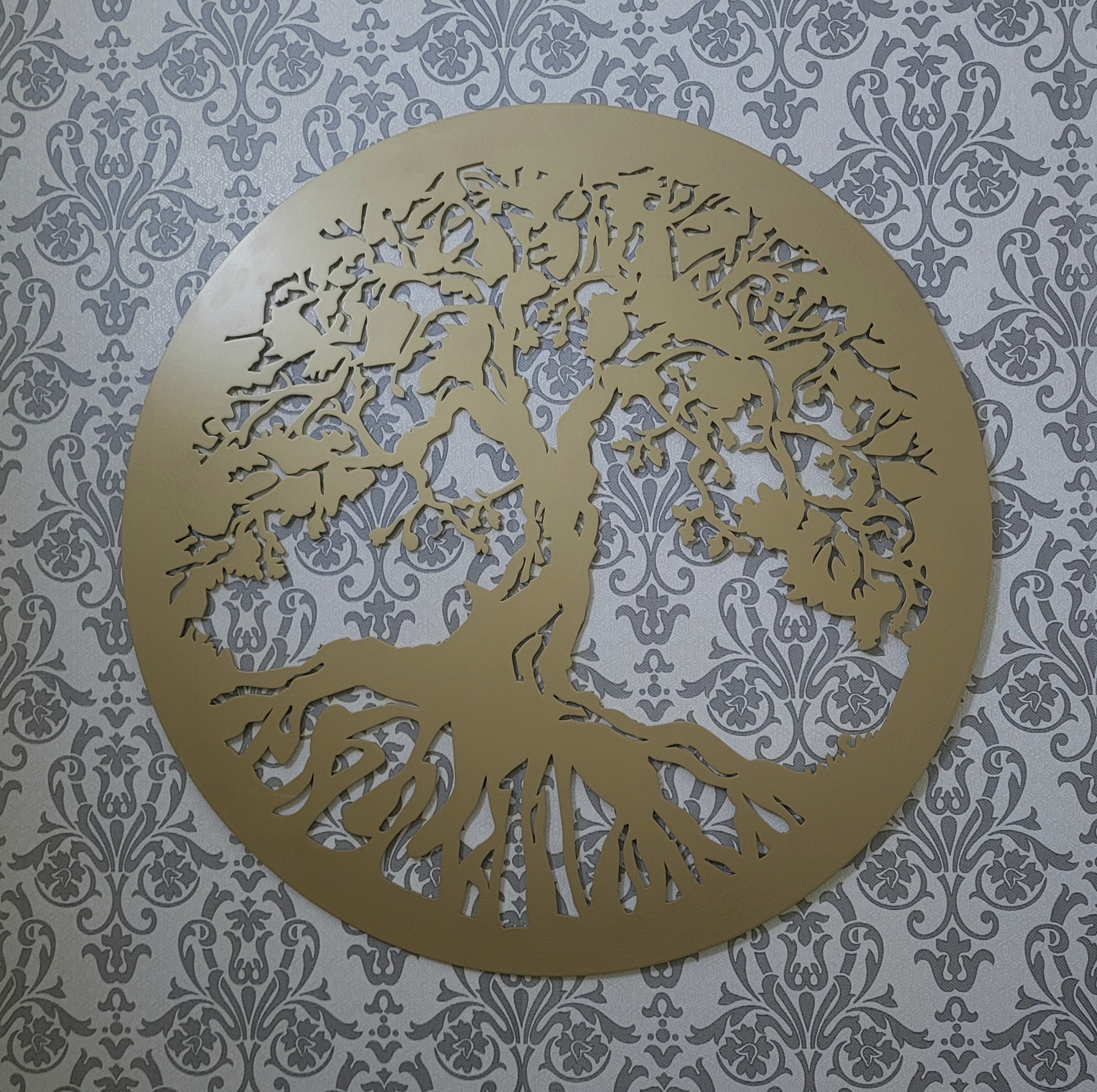 Decoratiune – "Copacul Vietii". Este realizata din material MDF, nuanta: Auriu. Dimensiuni: 84cm x 84cm