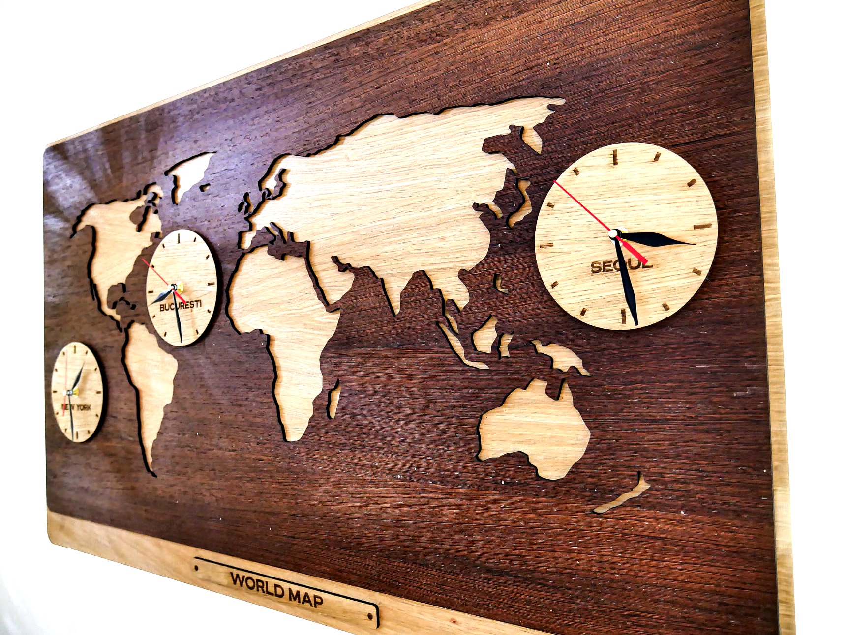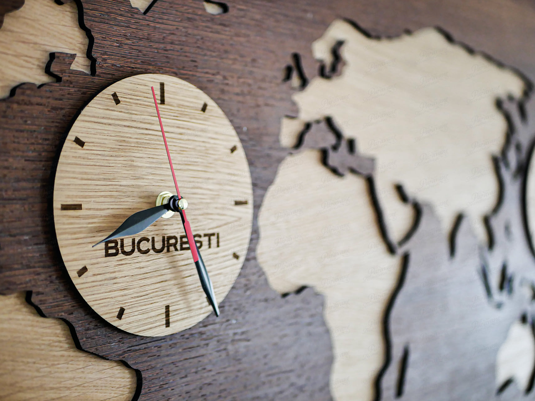 Nuante: wenge (lemn), stejar natur si prun (894 lei/bucata) sau material HDF nuante wenge si stejar, cu ceasuri incorporate functionale cu trei fusuri orare diferite( in functie de orasul ales de pe harta).