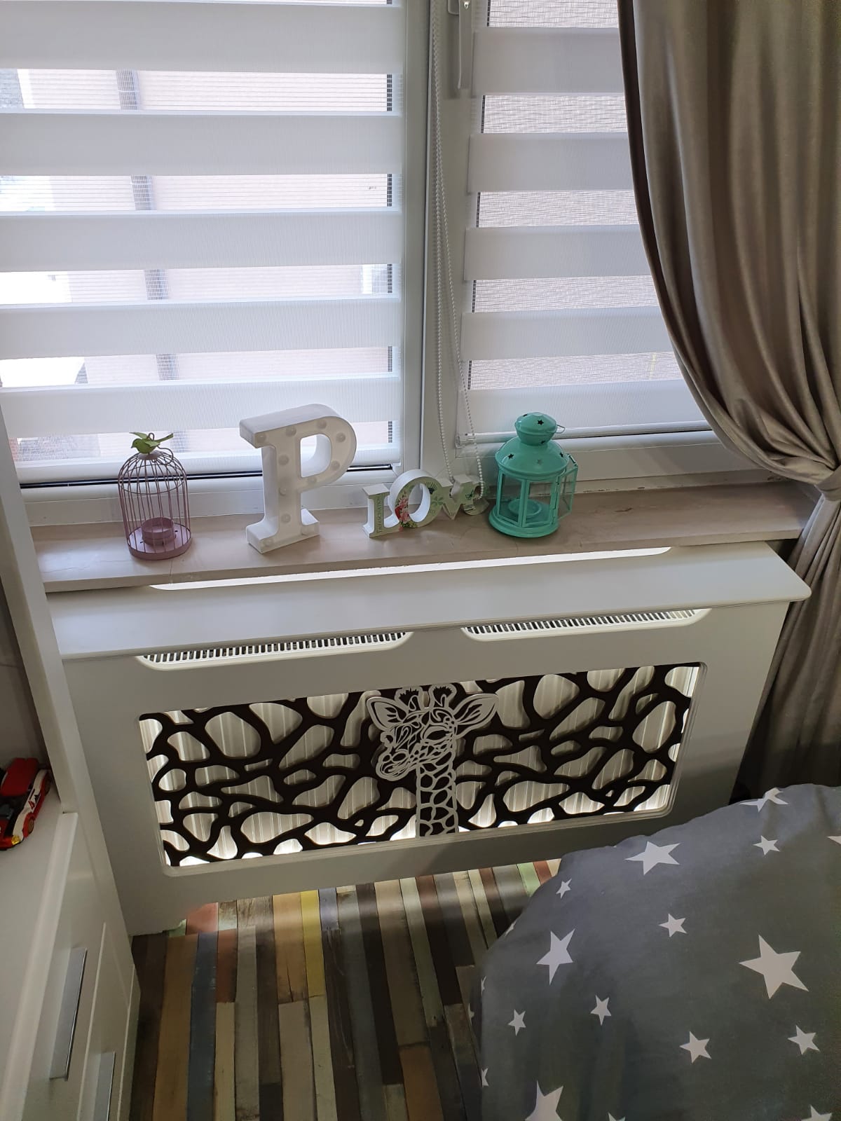 Masca de calorifer cu picior drept din material MDF vopsit, combinatie de culori - Model Baby Giraffe