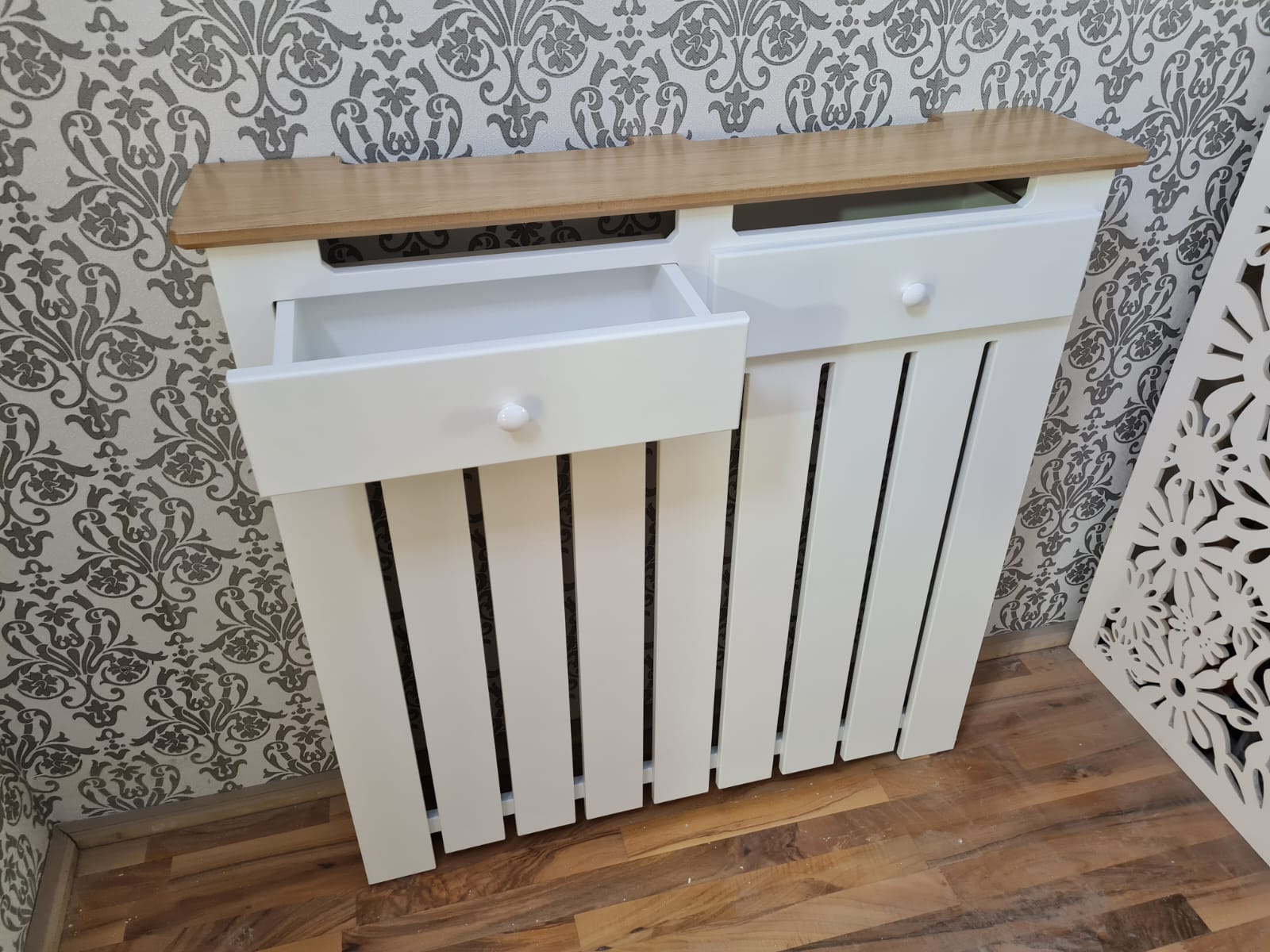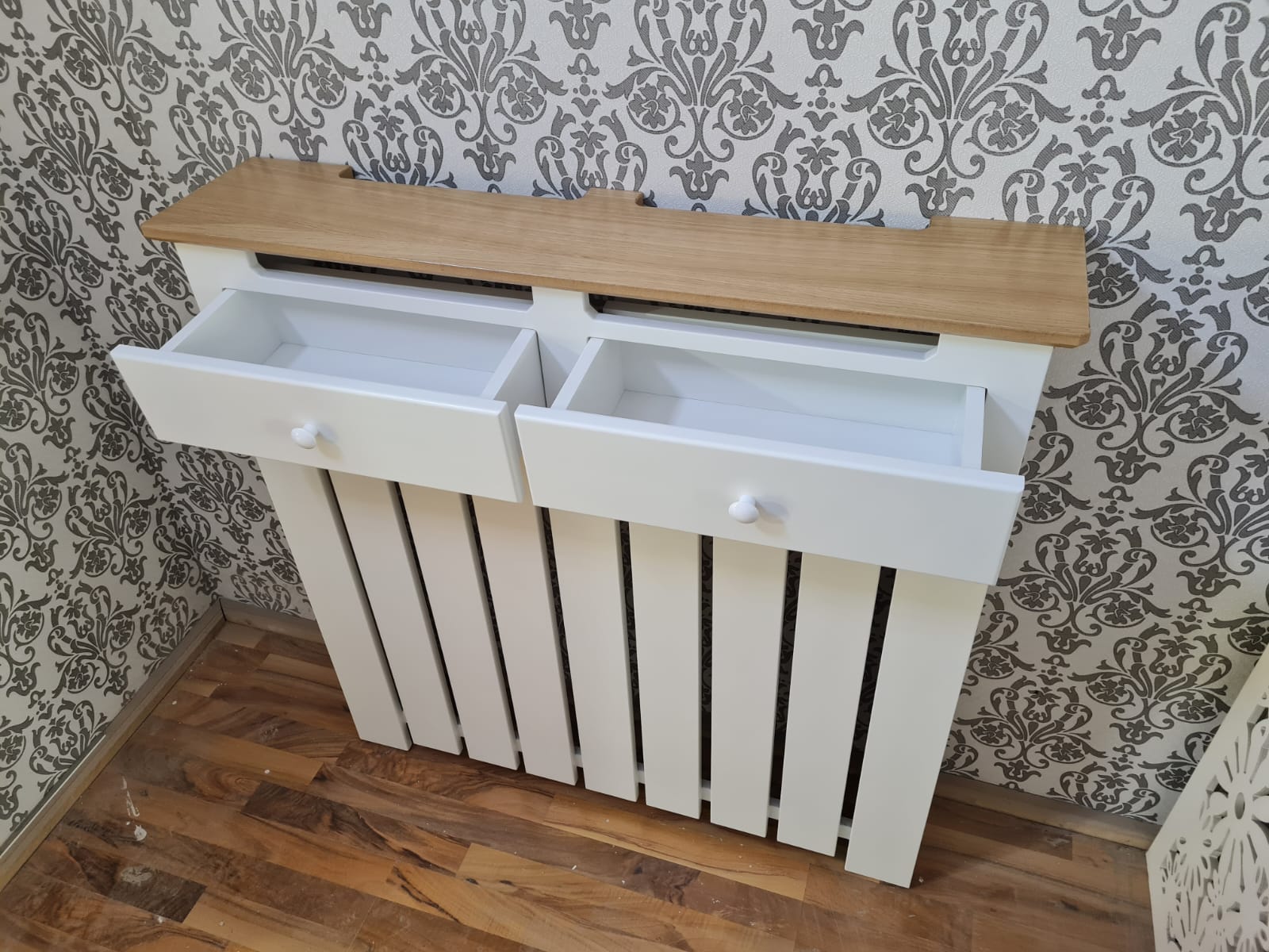 Masca de calorifer cu picior drept din material MDF vopsit, polita din MDF furniruit si sertare functionale - Model Romburi