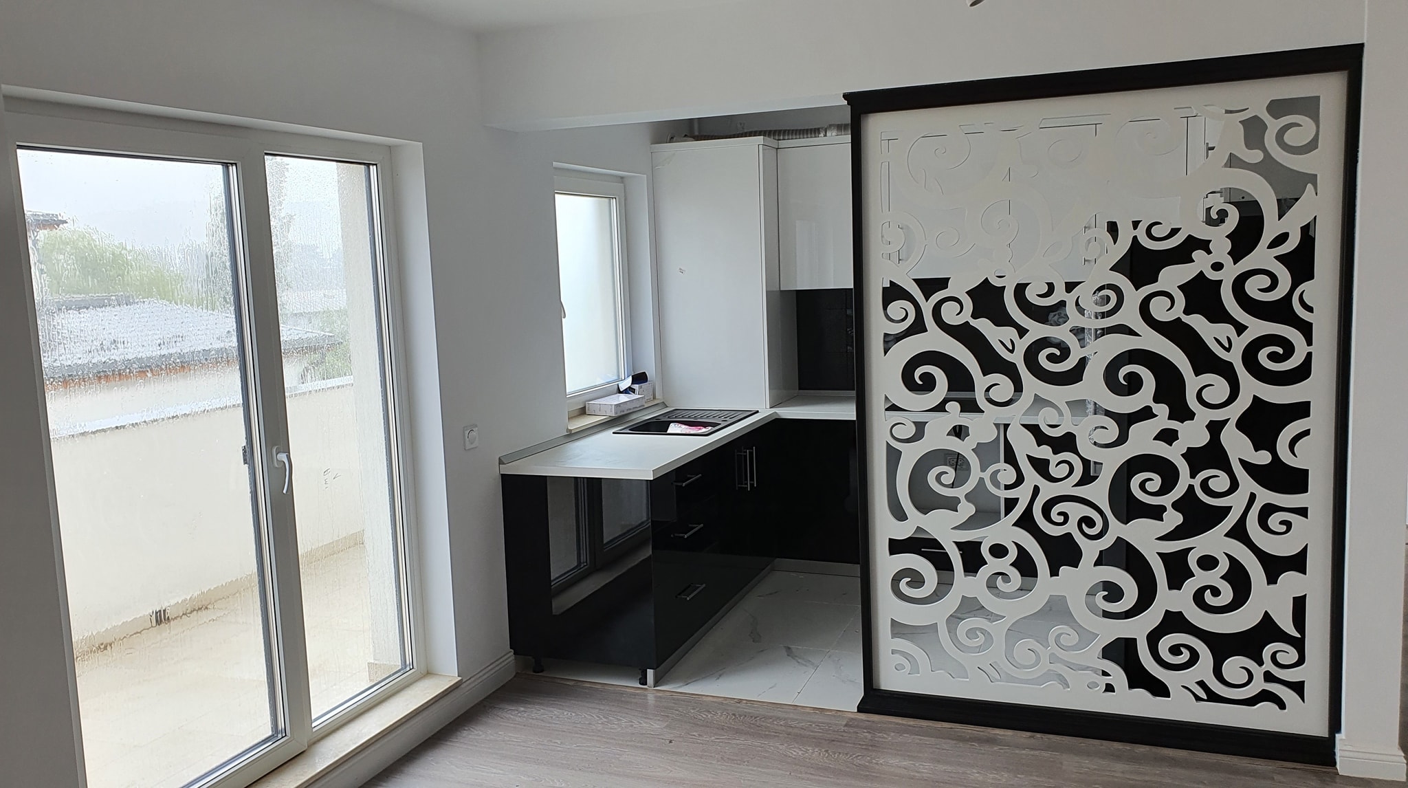 Paravan decorativ (ornamental), despartitor din material MDF vopsit in doua nuante, cu rama adaugata - Model Bucle
