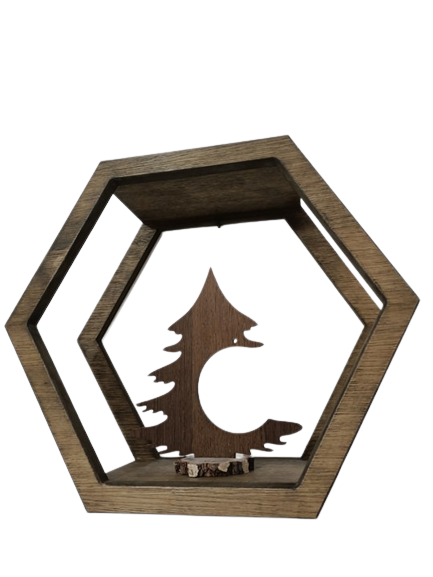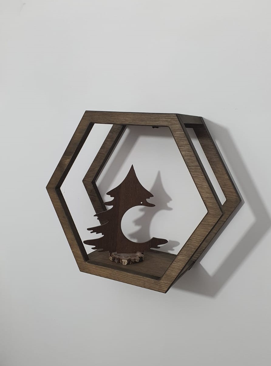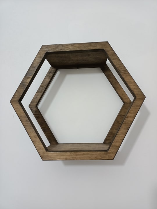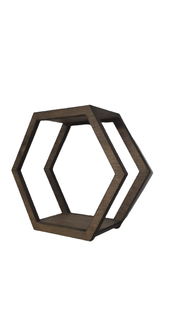 Raft hexagonal pentru perete din material MDF furniruit invechit. Dimensiuni: H 42cm x L 48,5cm x AD 19,5 cm. LICHIDARE DE STOC!
